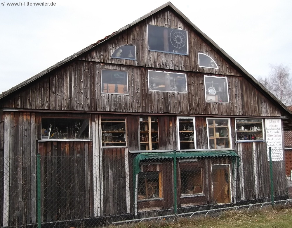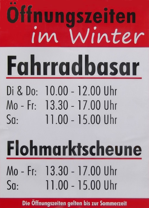 Gut erhaltene Möbel, Geschirr, Schaukelstühle, Nähmaschinen, Knöpfe und vieles mehr finden sich in der Scheune, vor der Einfahrt zum Recyclinghof. Flohmarktscheune und Fahrradbasar steht auf dem Schild am Eingang, auf dem auch die Öffnungszeiten verzeichnet sind. Auch vom Radweg an der neuen B31, ist das Geschäft gut zu sehen.